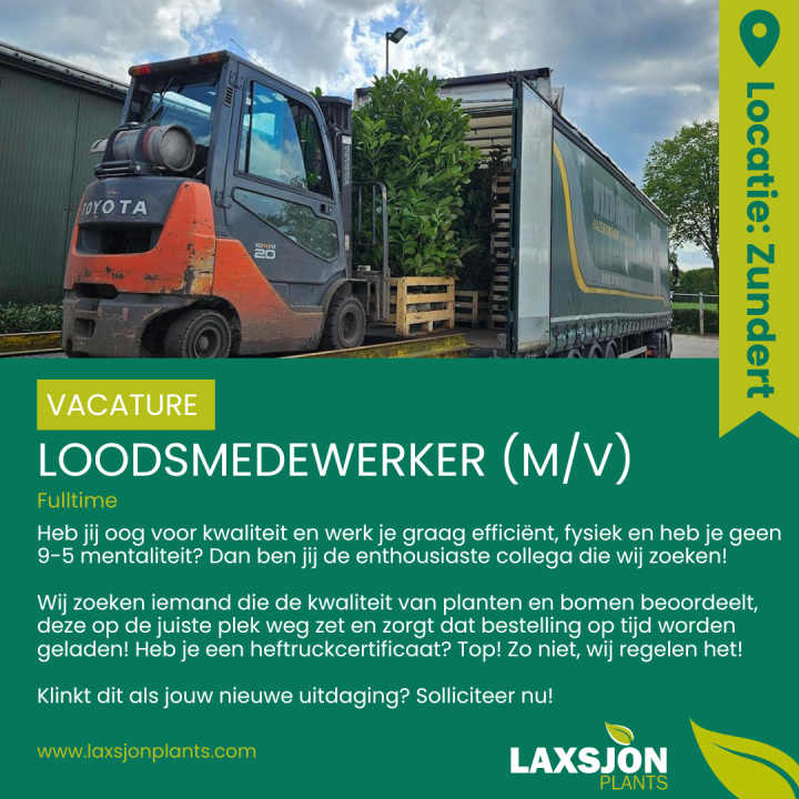Stuur je sollicitatie + cv naar loek@laxsjonplants.com of neem contact op met Loek 06-22824122